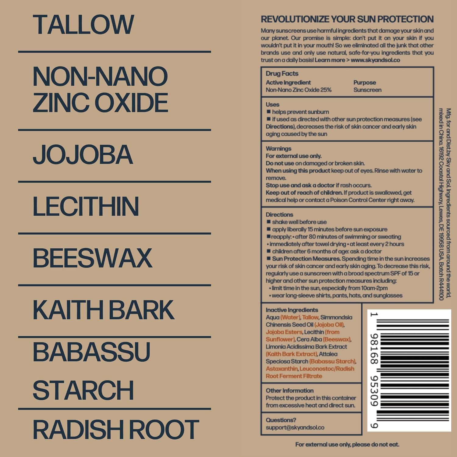 No—but that’s not its job. The real UV shield here is non-nano zinc oxide, a mineral sunscreen that sits on top of your skin and physically blocks UVA and UVB rays. Tallow’s role? It helps nourish and support your skin barrier, keeping it healthy, hydrated, and resilient under the sun.